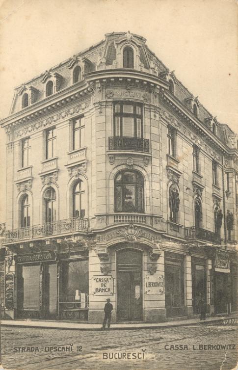 Completez cu câteva informații: Frédéric Damé a fotografiat în 1906 Banca L. Berkowitz, situată pe colț cu Smârdan (foto). În stânga ei nu apare masiva clădire din Lipscani 26. Se poate ca primul nivel să fi fost construit în 1884, iar urmatoarele după 1911, anul Planului cadastral (indicativul a însemnând un singur nivel).